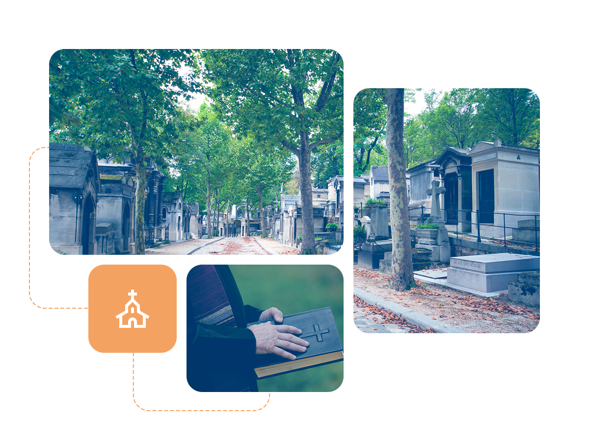 Evidence hrobových míst, pohřbených, nájemců, smluv, poplatků a jejich úhrad.